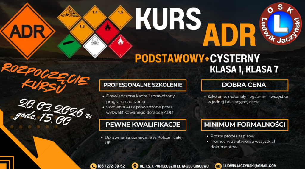 RUSZA KURS ADR – PODSTAWOWY + CYSTERNY (KLASA 1 i 7) 🚛